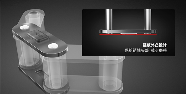 1)鏈板外凸設計,保護銷軸頭部,減少磨損;2)銷軸表面硬化處理,提高使用壽命。